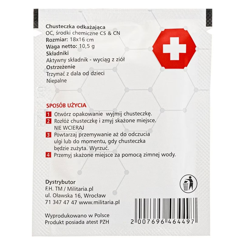 Chusteczka nasączona bezpiecznym środkiem do łagodzenia skutków porażenia gazami typu: