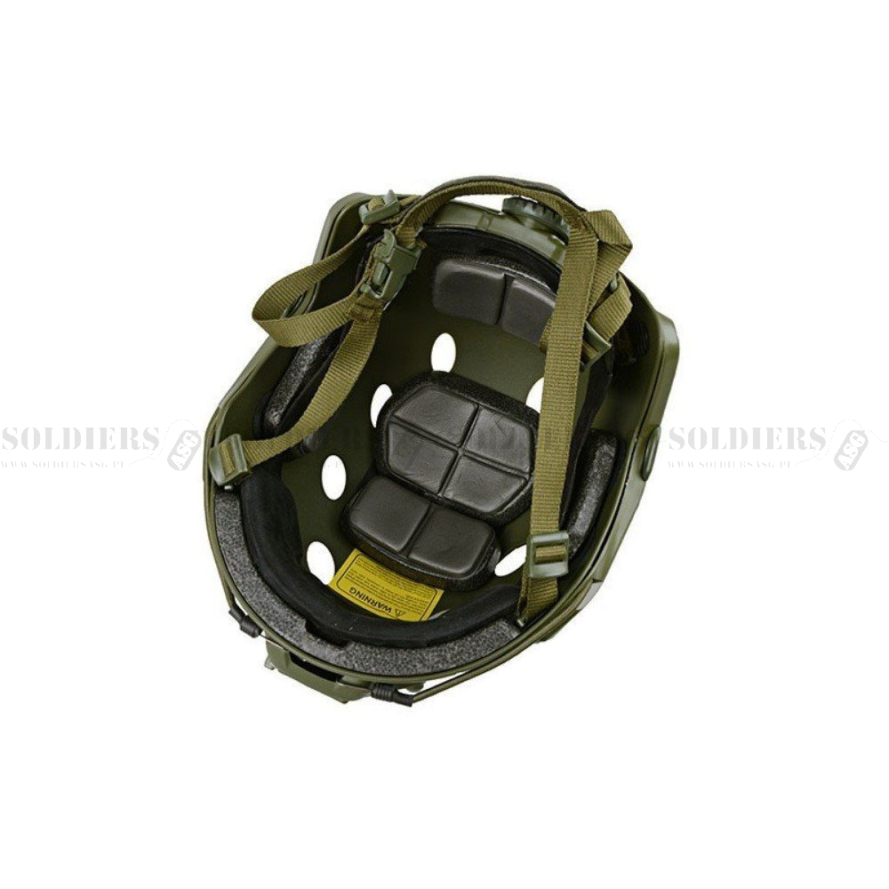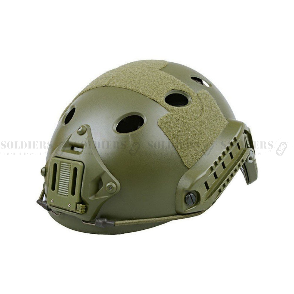 Hełm airsoftowy FAST gen.2 typu PJ od Delta Armory. Dzięki niewielkiej wadze i konstrukcji jest wygodny w noszeniu. Hełm mma rozmiar uniwersalny. Hełm wykonany jest z wytrzymałego i lekkiego tworzywa ABS. Wewnątrz hełmu znajdują się wkładki wykonane z miękkiej pianki, można je dowolnie ustawiać, są mocowane na rzep. Hełm posiada regulowany pasek pod brodę, jest klamra Fastex. Hełm wyposażony jest w boczne szyny montażowe, możliwość zamocowania latarki taktycznej lub mikrofonu. Z przodu hełmu znajduje się metalowe mocowanie NVG. W zestawie znajdują się szyny montażowe, wsporniki i klipsy.