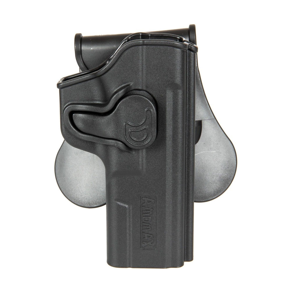 Wyprodukowana z wytrzymałego polimeru przez firmę Amomax kabura pistoletowa. Posiada intuicyjną blokadę zwalnianą palcem wskazującym podczas dobycia broni.