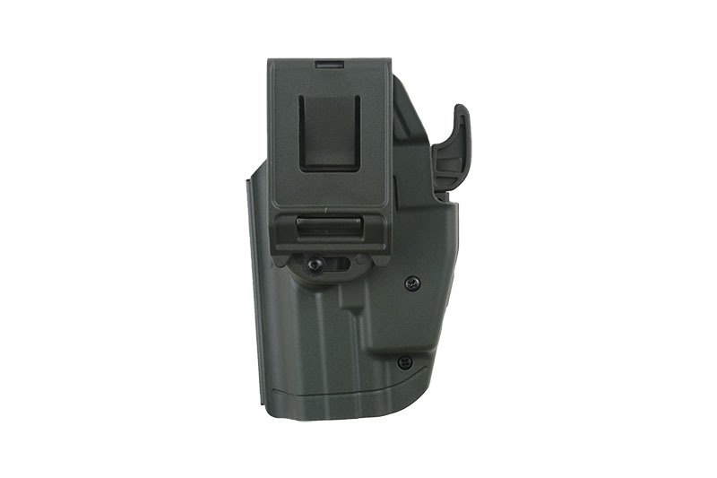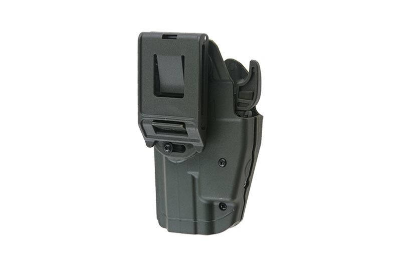 Przycisk zwalniacza blokady umieszczono z tyłu kabury, dzięki czemu wygodnie i bardzo szybko można go obsłużyć kciukiem lub środkowym palcem, minimalizuje również ryzyko przypadkowego naciśnięcia.