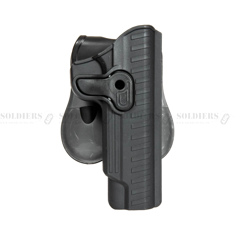 Lekka i wytrzymała polimerowa kabura dedykowana do replik pistoletów typu 1911. Kabura została wyposażona w regulowaną płetwę do mocowania na pasie o szerokości max 60mm. Prosta i skuteczna blokada zwalniana jest palcem wskazującym - doskonale chroni pistolet przed wypadnięciem, a dobywanie i chowanie pistoletu jest dzięki niej szybkie i intuicyjne.