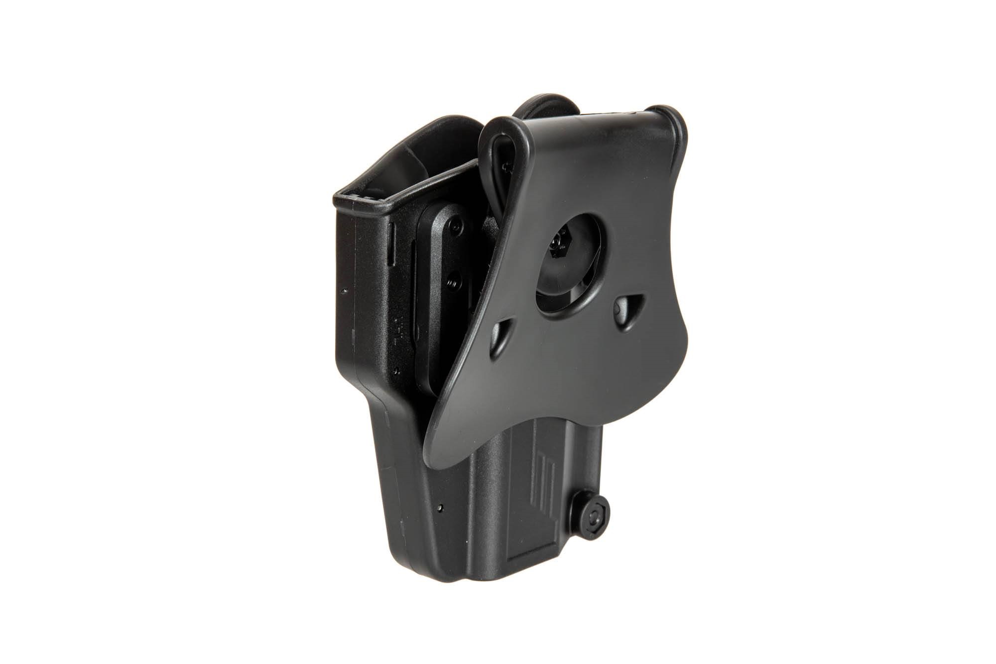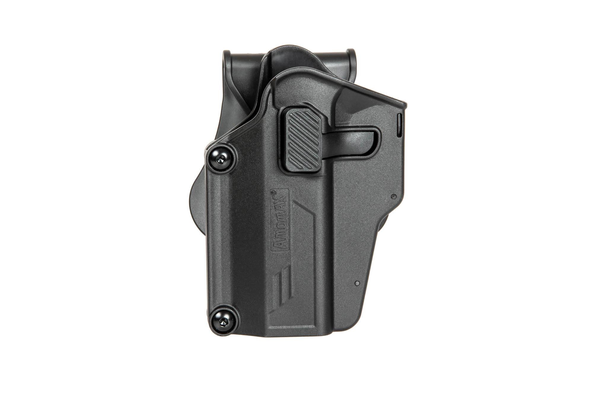Wyprodukowana z wytrzymałego polimeru przez firmę Amomax kabura uniwersalna do replik. Dzięki specjalnej konstrukcji, kabura jest kompatybilna z ponad 80 rodzajami pistoletów, w tym najpopularniejszymi jak Glock, Sig Sauer, CZ, Ruger, Beretta czy Colt 1911.