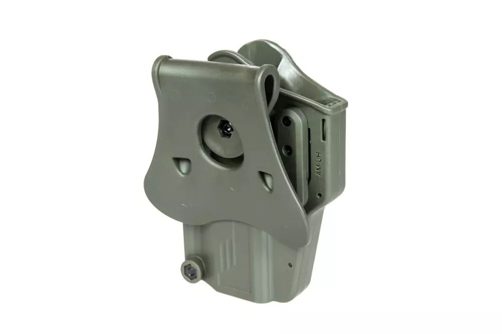 Wyprodukowana z wytrzymałego polimeru przez firmę Amomax kabura uniwersalna do replik. Dzięki specjalnej konstrukcji, kabura jest kompatybilna z ponad 80 rodzajami pistoletów, w tym najpopularniejszymi jak Glock, Sig Sauer, CZ, Ruger, Beretta czy Colt 1911.