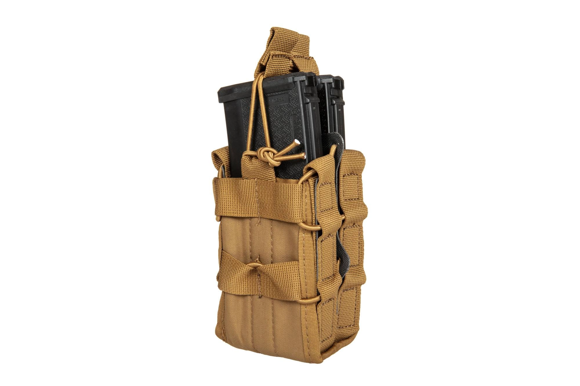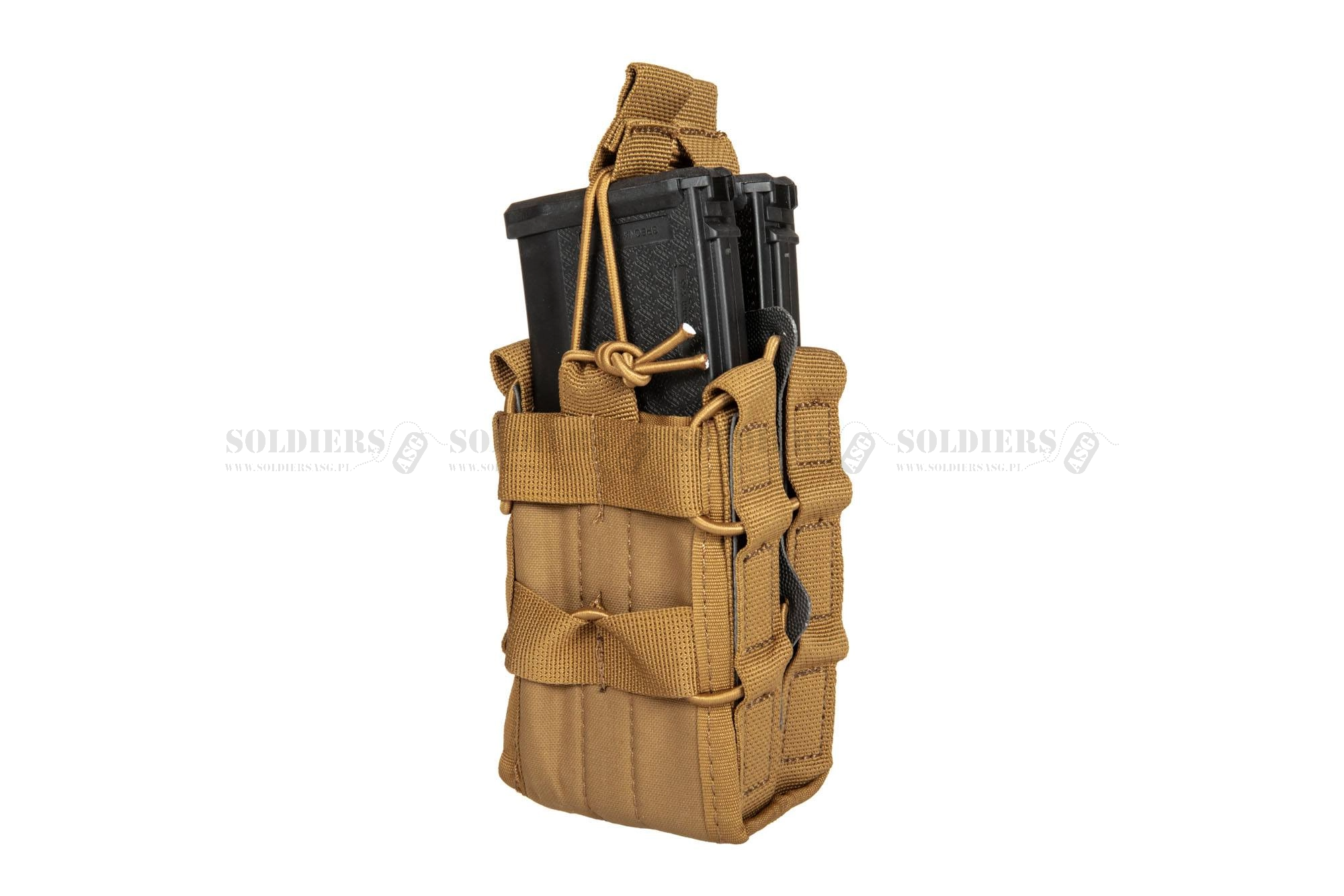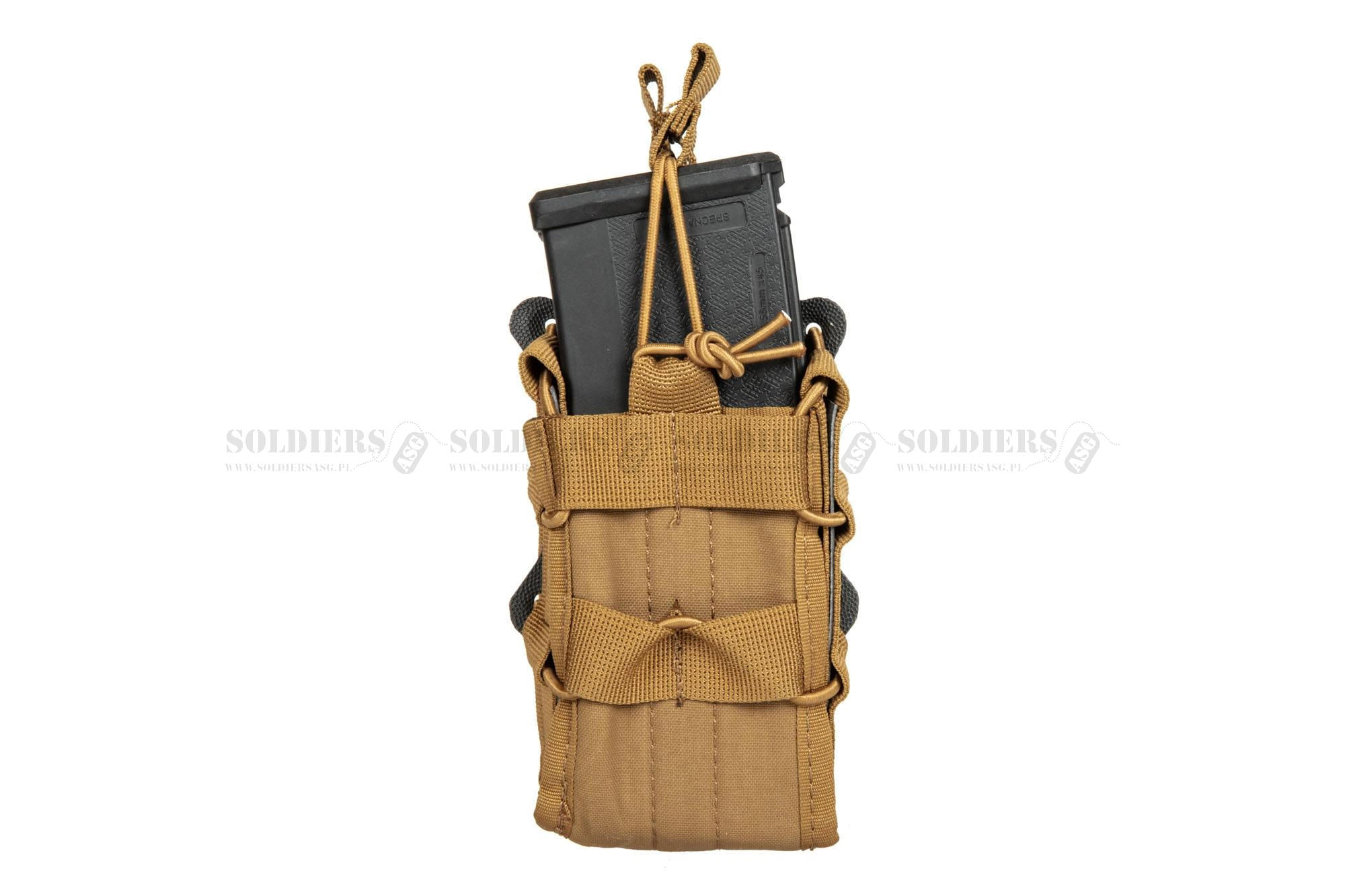 Podwójna ładownica uniwersalna typu shingle na 2 magazynki została wykonana z lekkiego i trwałego materiału Aspen 500D. Zastosowanie wytrzymałych szwów oraz wysokiej jakości akcesoriów jak taśmy dodatkowo zwiększają odporność i trwałość. Dzięki dzięki możliwości regulowania objętości pomieści magazynki typu AK / M4 / G36 / M14 / SR25 oraz wiele innych. Magazynek jest od góry zabezpieczony przed wypadnięciem elastyczną linką typu shock-cord.