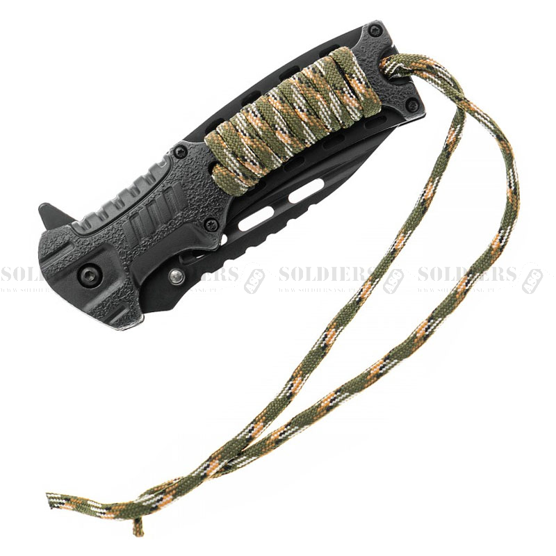 Model wyposażony został w nylonową linkę typu paracord, krzesiwo oraz gwizdek.
