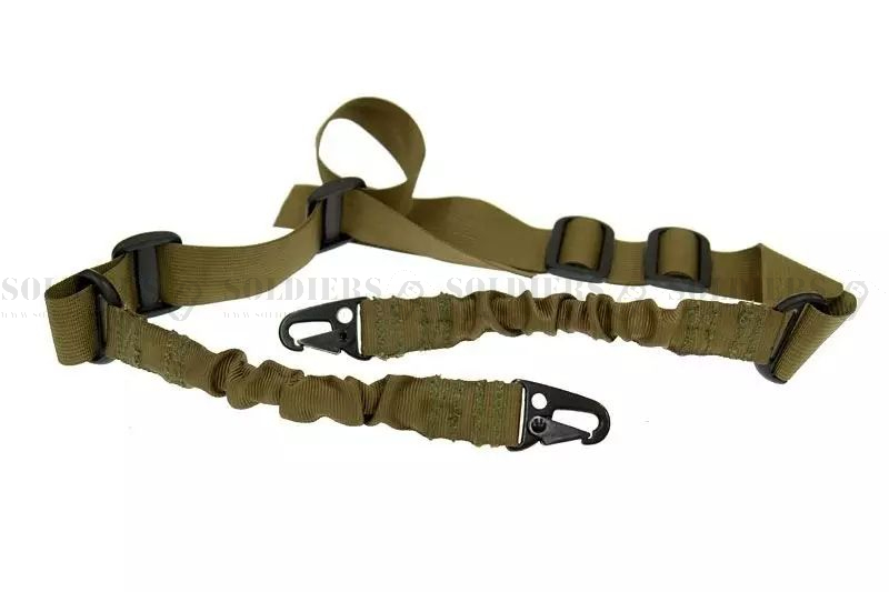 Dwupunktowy pas nośny typu bungee o regulowanej długości, wykonany z trwałego nylonu. Do repliki mocowany przy pomocy metalowego karabinka.