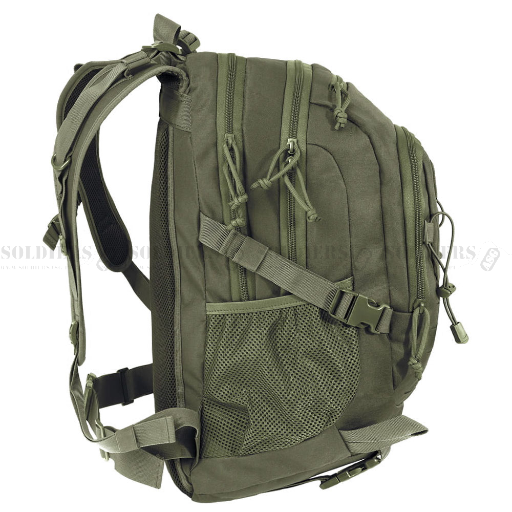 Model posiada system Laser Cut do mocowania dodatkowego oporządzenia. Na froncie znajduje się rzep identyfikacyjny na różnego rodzaju naszywki, flagi i inne patche. Po bokach kieszeni naszyto dodatkowe pętle z linkami bungee, dzięki którym mamy możliwość przytroczyć dodatkowy ekwipunek taki jak karimata, kije trekingowe, siekierkę itp. U góry znajduje się mała kieszonka na drobiazgi takie jak zapalniczka , krzesiwo , klucze, pendrive itp. Na bokach naszyto 2 kieszonki wykonane z siatki kaletniczej. Możemy przenosić w nich bidon, butelkę lub inne drobne przedmioty do których potrzebujemy szybkiego dostępu.