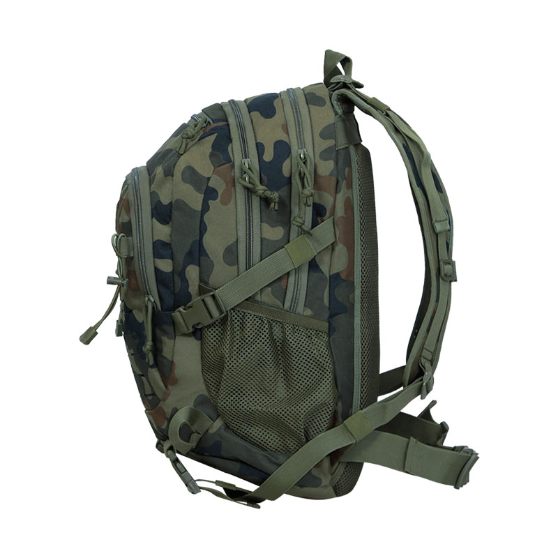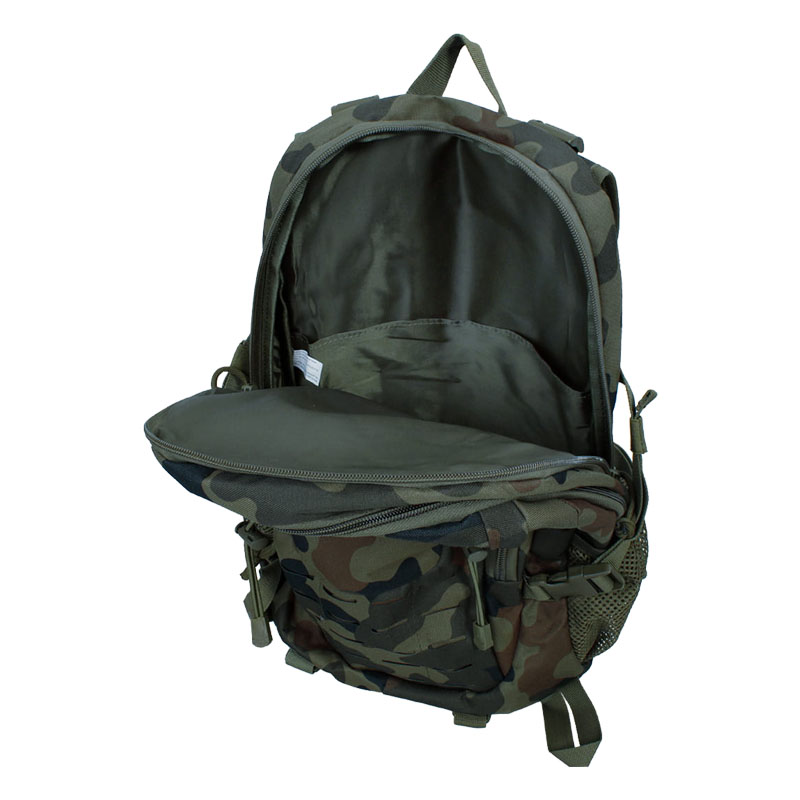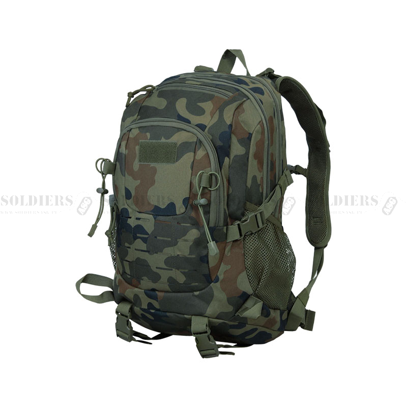 Model posiada system Laser Cut do mocowania dodatkowego oporządzenia. Na froncie znajduje się rzep identyfikacyjny na różnego rodzaju naszywki, flagi i inne patche. Po bokach kieszeni naszyto dodatkowe pętle z linkami bungee, dzięki którym mamy możliwość przytroczyć dodatkowy ekwipunek taki jak karimata, kije trekingowe, siekierkę itp. U góry znajduje się mała kieszonka na drobiazgi takie jak zapalniczka , krzesiwo , klucze, pendrive itp. Na bokach naszyto 2 kieszonki wykonane z siatki kaletniczej. Możemy przenosić w nich bidon, butelkę lub inne drobne przedmioty do których potrzebujemy szybkiego dostępu.