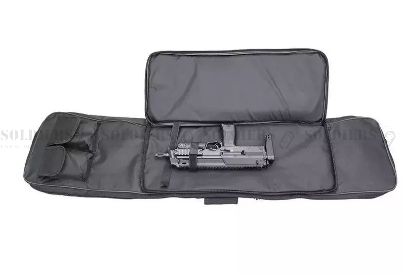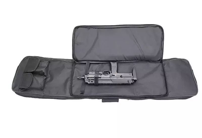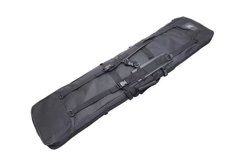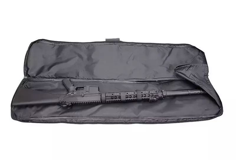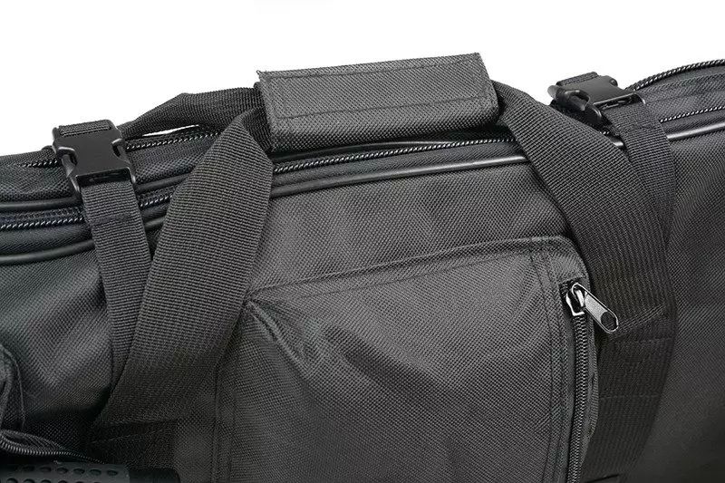Pokrowiec wykonany jest z nylonu. Dzięki zastosowaniu dodatkowego kołnierza, pokrowiec bez problemu zmieści każdą broń o długości do 1300mm. Wewnątrz głównej komory znajdują się dodatkowo dwa pasy mocujące broń. W przedniej kieszeni o wymiarach 620x260mm zmieścimy pistolet maszynowy. W niej również znajdują się pasy mocujące.