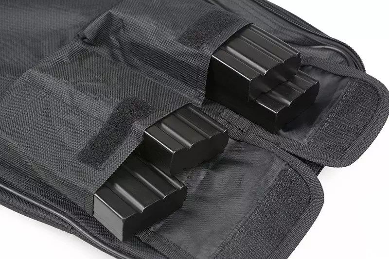 Dodatkowo pokrowiec zaopatrzony jest w zewnętrzne kieszenie na magazynki oraz inne akcesoria niezbędne na strzeleckie. Na części plecowej pokrowca znajduje się zamek błyskawiczny umieszczony w poprzek pokrowca, umożliwiający dostęp do płaskiej kieszeni o powierzchni pokrowca. Pokrowiec można transportować zarówno w dłoni jak torbę, jak i na plecach jak plecak.