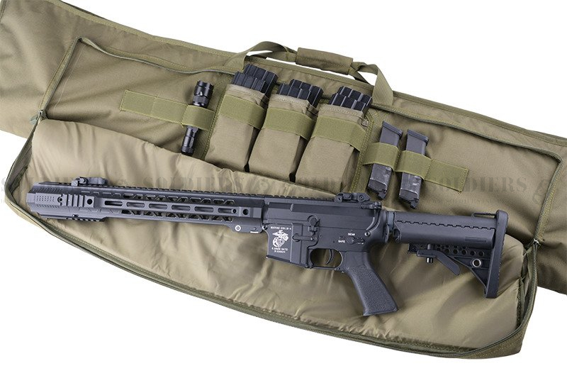 Wewnątrz głównej komory znajdują się sześć pasów stabilizujących. Mniejsza komora o wymiarach 770x220mm posiada trzy ładownice mieszczące po dwa magazynki każda oraz elastyczne pasy utrzymujące dodatkowe akcesoria na miejscu. Z zewnątrz została obszyta taśmami MOLLE pozwalającym na rozbudowanie pokrowca o dodatkowe kieszenie. Całość jest chroniona przy pomocy miękkiej gąbki.
