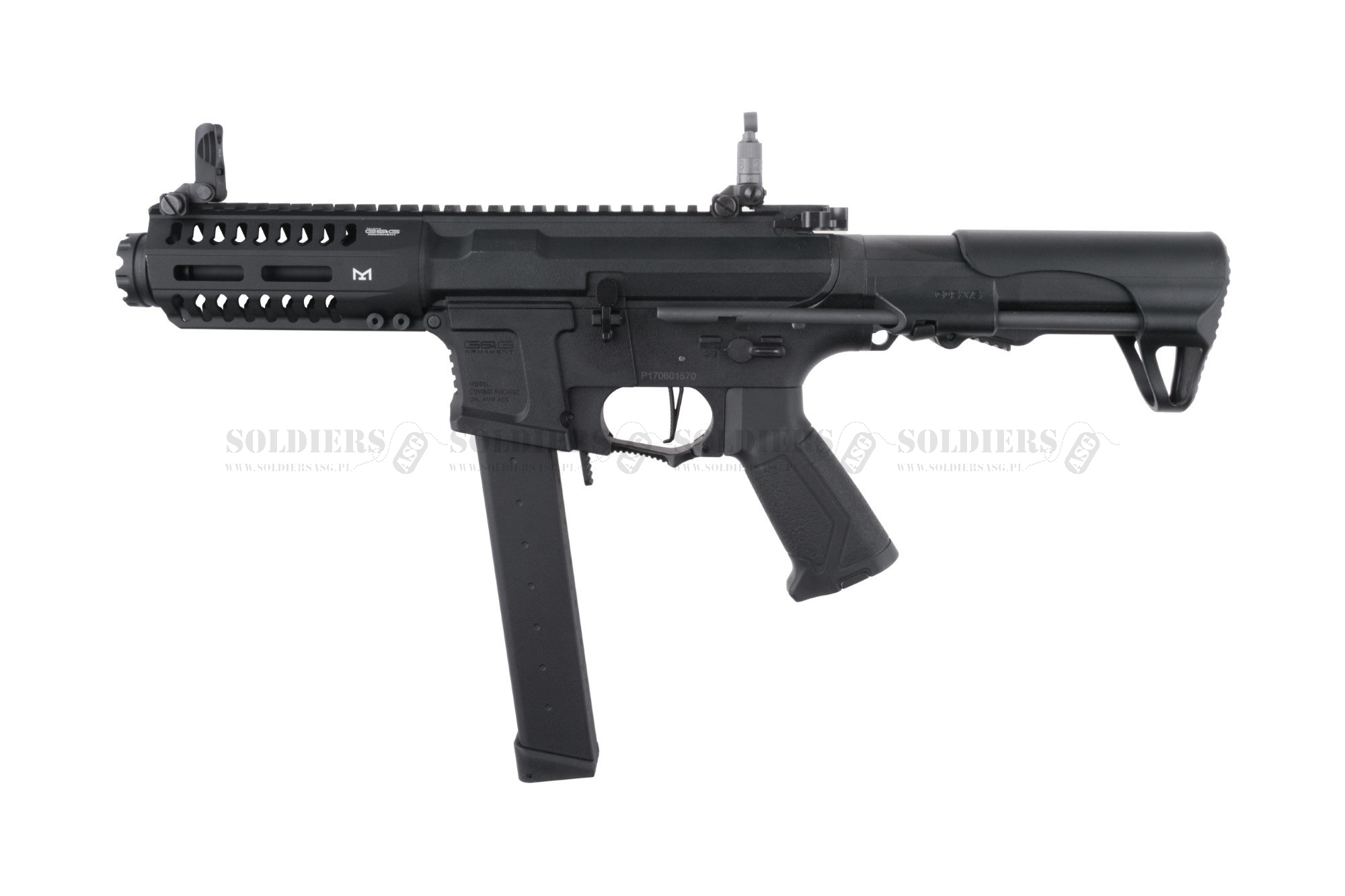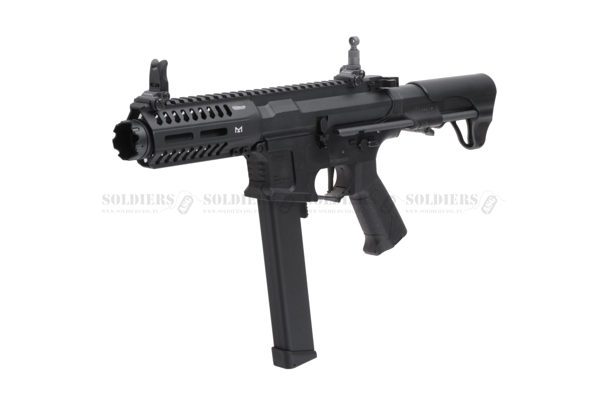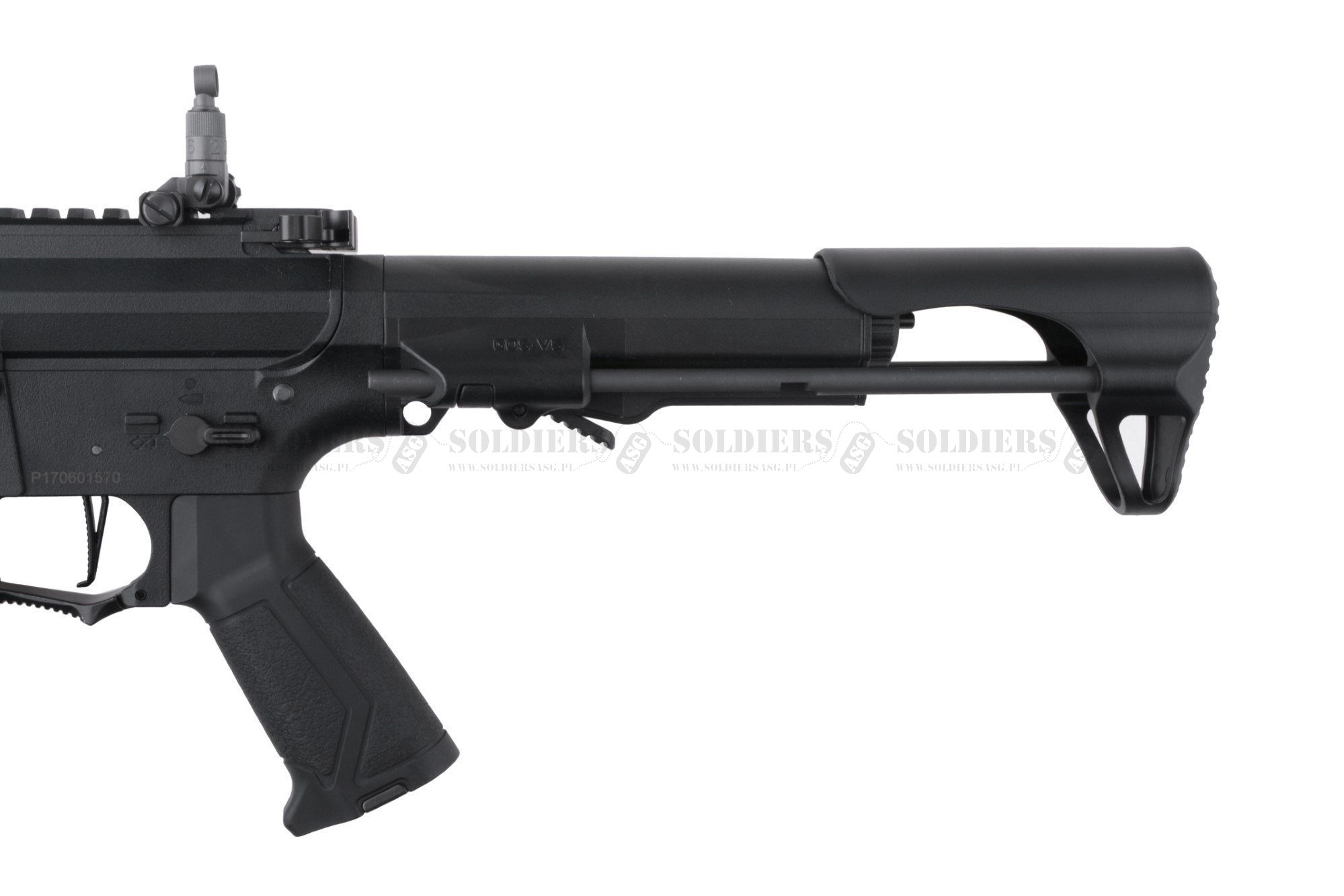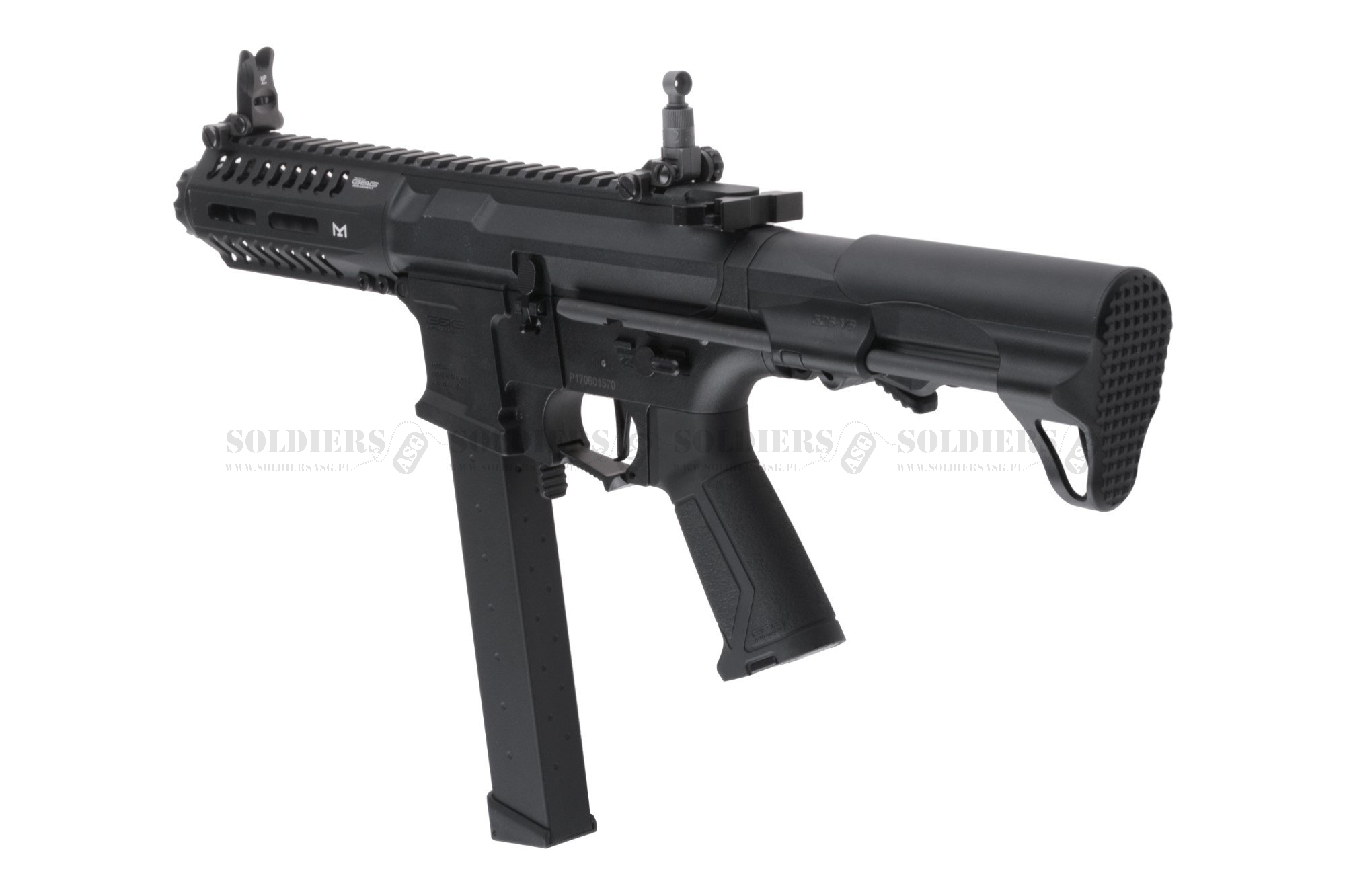 Na pierwszy rzut oka replika przypomina kolejną replikę z serii AR-15, ale prócz zastosowania Gearboxa w wersji 2 czy chwytu pistoletowego podobieństwa się kończą. Otrzymujemy solidną, kompaktową replikę typu PDW. Replikę wyposażono w składaną kolbę wykonaną ze stali i tworzywa sztucznego, w prowadnicy zaś ukryto wtyczkę na akumulator (brak w zestawie) i układ mosfet. W replice zastosowano customowy chwyt pistoletowy, spust oraz metalową szynę w systemie M-LOK®, posiadającą oznaczenia licencyjne. Na grzbiecie repliki umieszczono składane przyrządy celownicze. Prócz mocnego polimeru replika posiada stalowe elementy, są to m.in.: element kolby, klapka wyrzutnika łusek którą otwiera się powiększoną rączką przeładowania oraz śruby i piny. Lufę repliki wieńczy customowe urządzenie wylotowe. W zestawie znajdziemy magazynek hi-cap o pojemności 300 kulek.