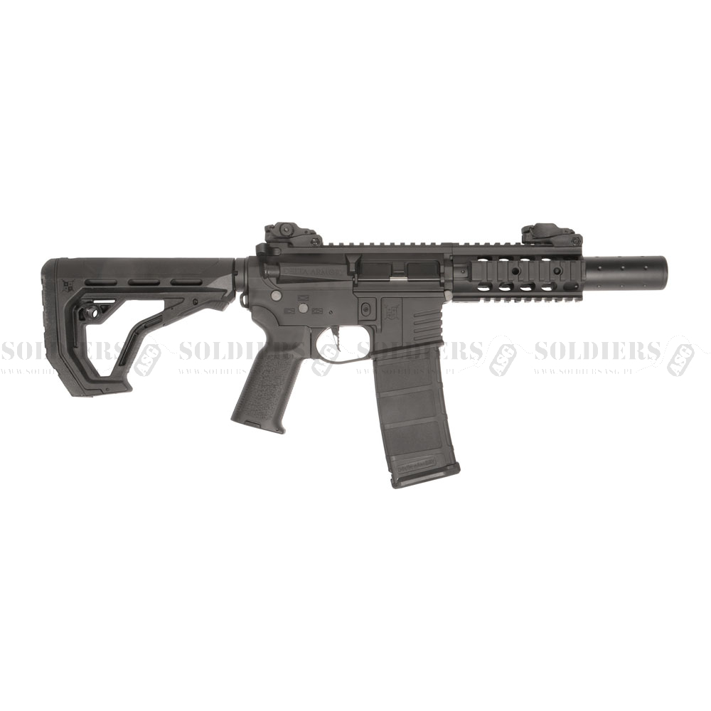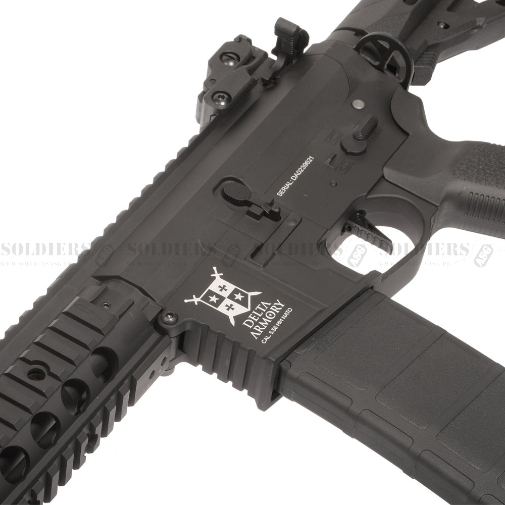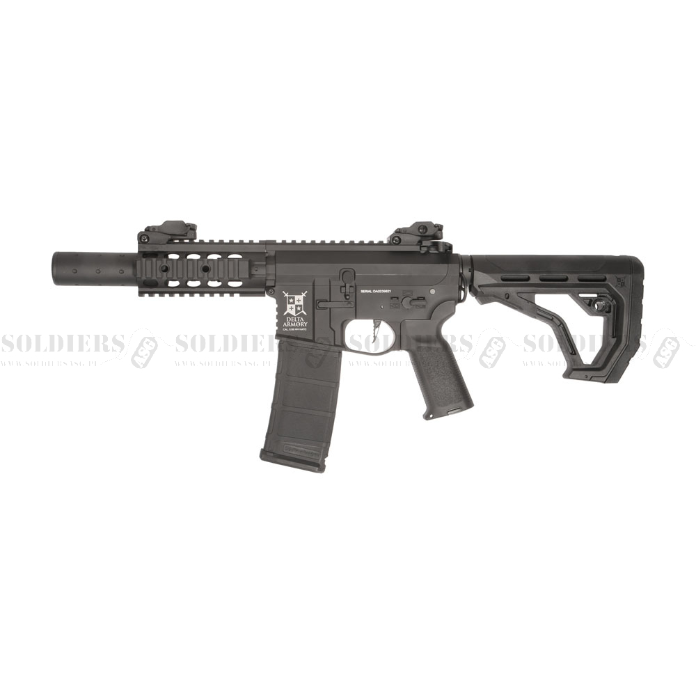 Karabinek AR15 SilentOps CQB Alpha ma konstrukcję FULL METAL, w której cała broń (chwyt przedni, korpus, spust, pętla zawiesia i inne mniejsze części zewnętrzne) jest wykonana z metalu. Tłumik zawiera piankę pochłaniającą wstrząsy. Model SilentOps CQB jest idealny do gier CQB. karabin posiada regulowany tylny celownik, zamontowany na szynie RIS.
