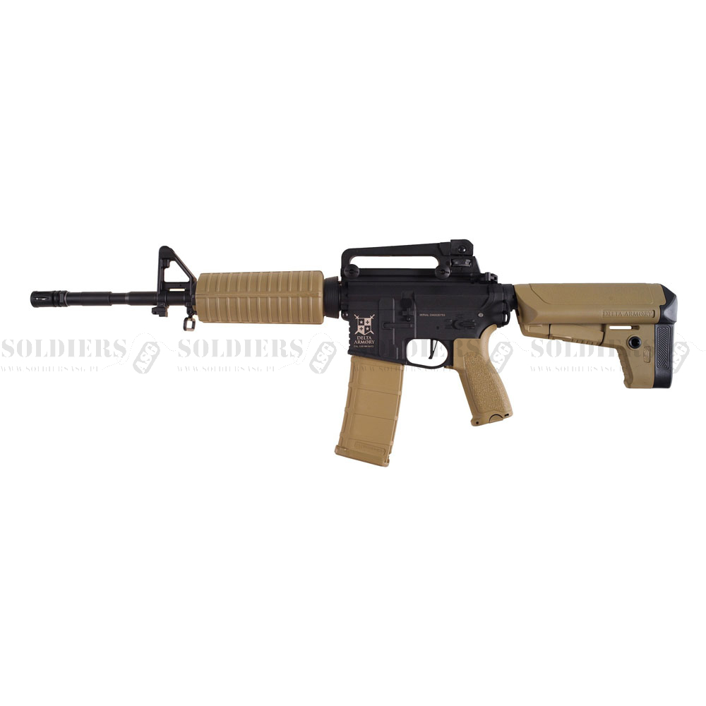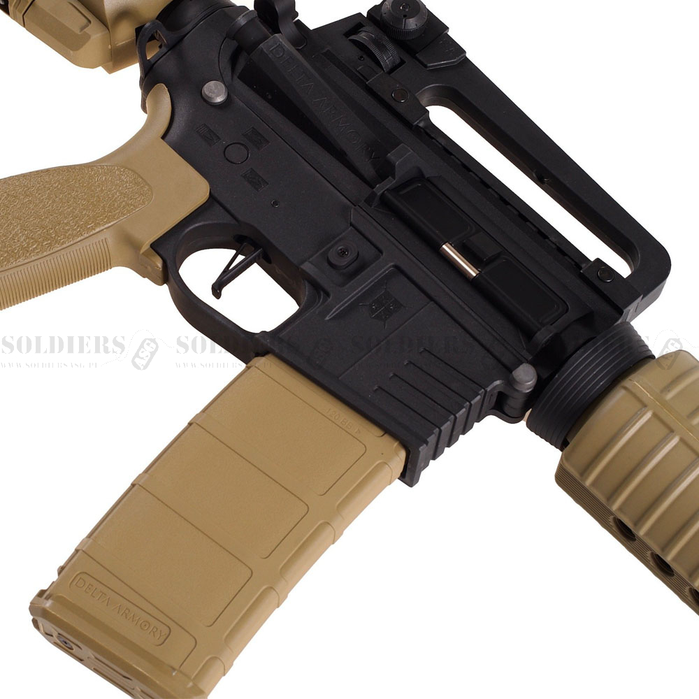 AR15 - M4 od Delta Armory. Seria Charlie charakteryzuje się wysokiej jakości częściami wewnętrznymi, takimi jak tłok SHS z pełnymi metalowymi zębami, opóźniacz zębatki SHS, rotacyjna komora Hop-up, wzmacniany gearbox, który wytrzymuje sprężyny M120 - M130, lufa wewnętrzna 6,03 mm.