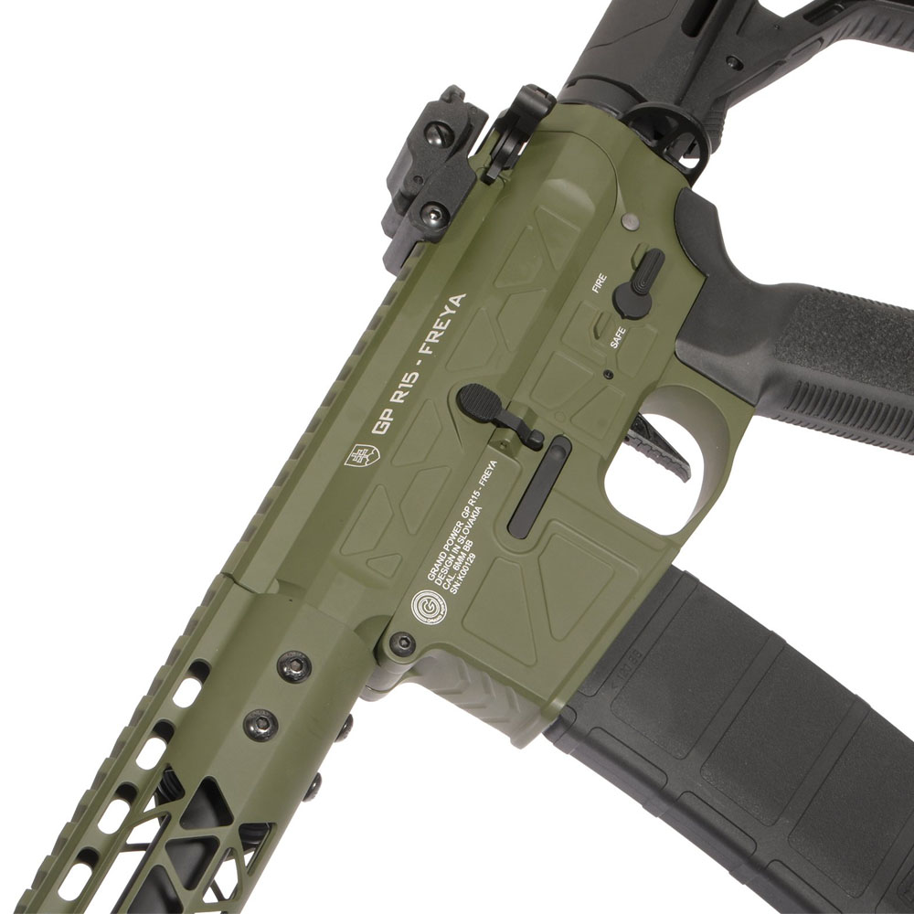 R15 FREYA to licencjonowane airsoftowe repliki prawdziwych karabinów słowackiego producenta Grandpower. Różnią się głównie nowoczesnym designem korpusu, który został zaprojektowany na Słowacji. Delta Armory dodała do serii FREYA swój najnowszy opto-magnetyczny procesor Eagle ETU, który zapewnia szybką reakcję spustu, jednocześnie czyniąc replikę gotową do użycia z akumulatorami LiPo 11.1V. Oczywiście jest złącze Deans-T, które zastąpiło klasyczne złącze Tamiya.