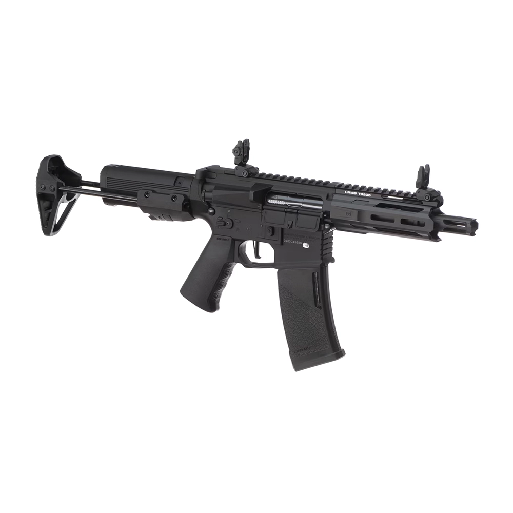 Oburęczne przełączniki pozwalają korzystać z repliki niezależnie od dominującej ręki. KRYTAC Compact Carbine Stock to dwupozycyjna kolba z bardzo pojemną komorą na baterię. Po naciśnięciu przycisku może zostać wysunięta o 4 cale. MOSFET Nautilus zabezpiecza obwody i jest strategicznie umieszczony z tyłu skrzyni biegów, aby zmaksymalizować przestrzeń w komorze baterii.