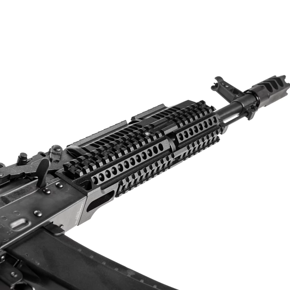 Replika doskonale sprawdzi się na średnich i dalszych dystansach. Pokrywa zamka została przykręcona bezpośrednio do dolnej części frontu, co zapewnia sztywność montażu i możliwość precyzyjnego montowania optyki. Szyna boczna AK typu dovetail umożliwia instalację celowników dedykowanych do tej platformy.
