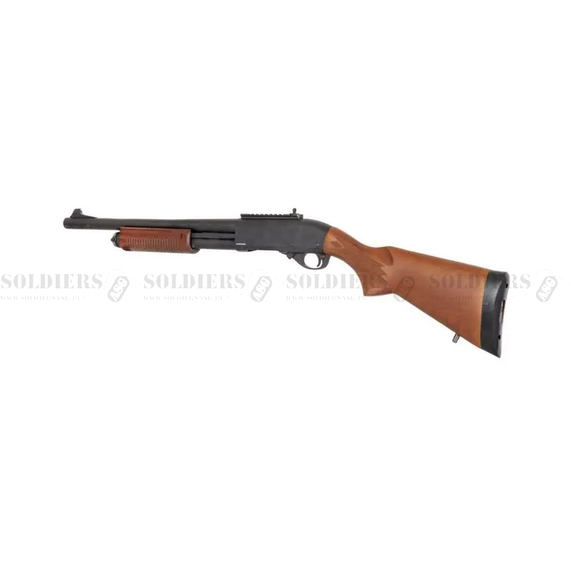 Zasilaną Green Gasem replikę strzelby wykonano prawie w całości z metalu. Metalowa jest: lufa, korpus, czy szyna RIS umieszczona na grzbiecie. Z naturalnego drewna wykonano kolbę oraz łoże.