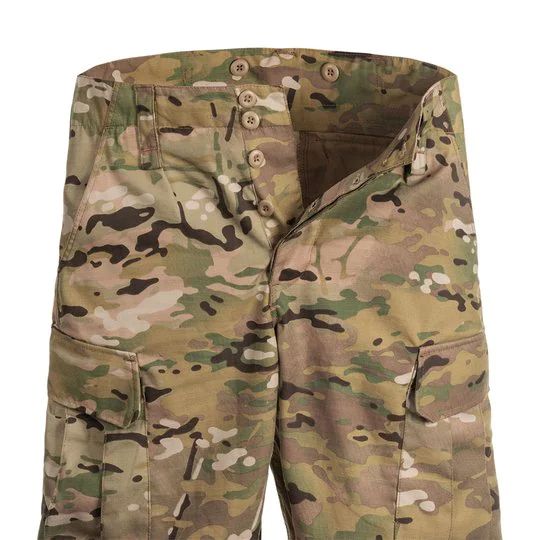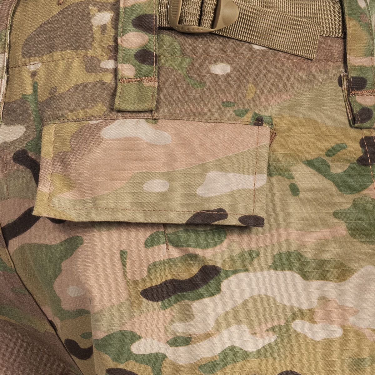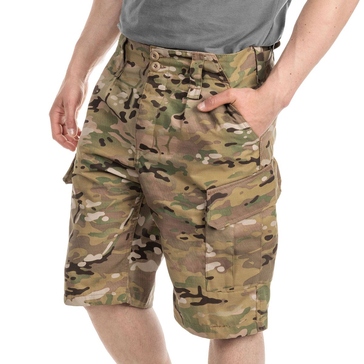 Szorty wykonano w kamuflażu wzorowanym na MultiCam, który sprawdza się szczególnie dobrze w półpustynnych terenach.
