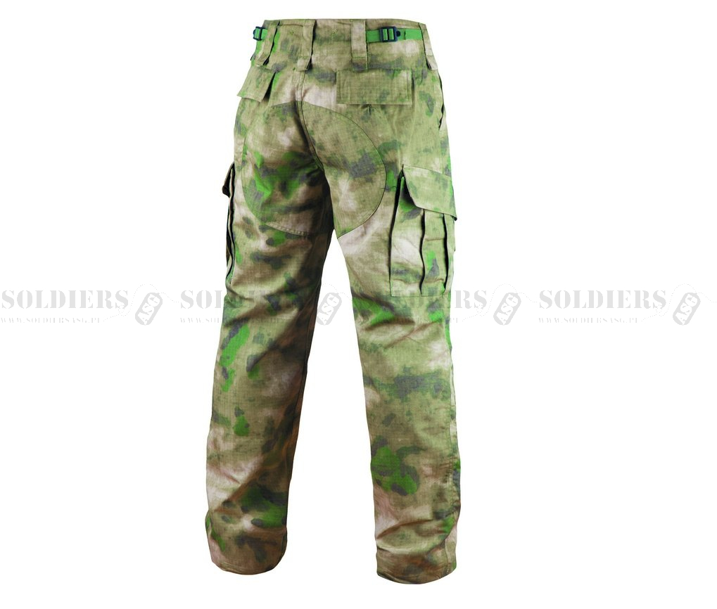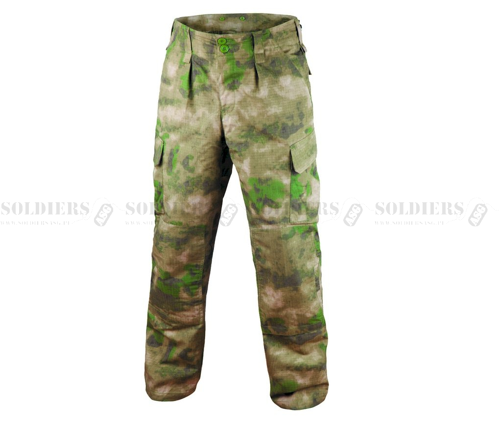 Spodnie bojówki wykonano z tkaniny policotton (poliester oraz bawełna). Materiał jest lekki, wytrzymały i przyjemny w dotyku. W modelu zastosowano splot RipStop, który zwiększa odporność materiału na rozdarcia.