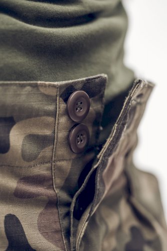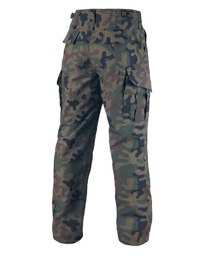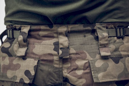 Spodnie bojówki wykonano z tkaniny policotton (poliester oraz bawełna). Materiał jest lekki, wytrzymały i przyjemny w dotyku. W modelu zastosowano splot RipStop, który zwiększa odporność materiału na rozdarcia.