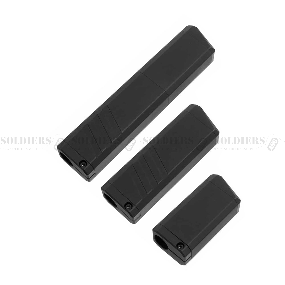 Tłumik wypełniony pianką akustyczną o różnych rozmiarach celem zwiększenia jej efektywności w wyciszaniu repliki. Dzięki modułowości tłumika można z niego korzystać w trzech różnych konfiguracjach długości, 170mm / 110mm / 80mm i zmieniać między nimi dowolnie gdy poczujemy taką potrzebę.
