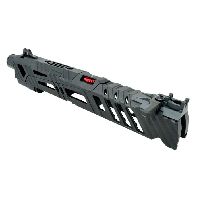Zamek wykonany jest z niezwykle trwałego aluminium 6061, precyzyjnie obrabianego CNC, i posiada konstrukcję split-slide (tylko część zamka się porusza) z modyfikacją dla nieruchomej zewnętrznej lufy (bez odrzutu).