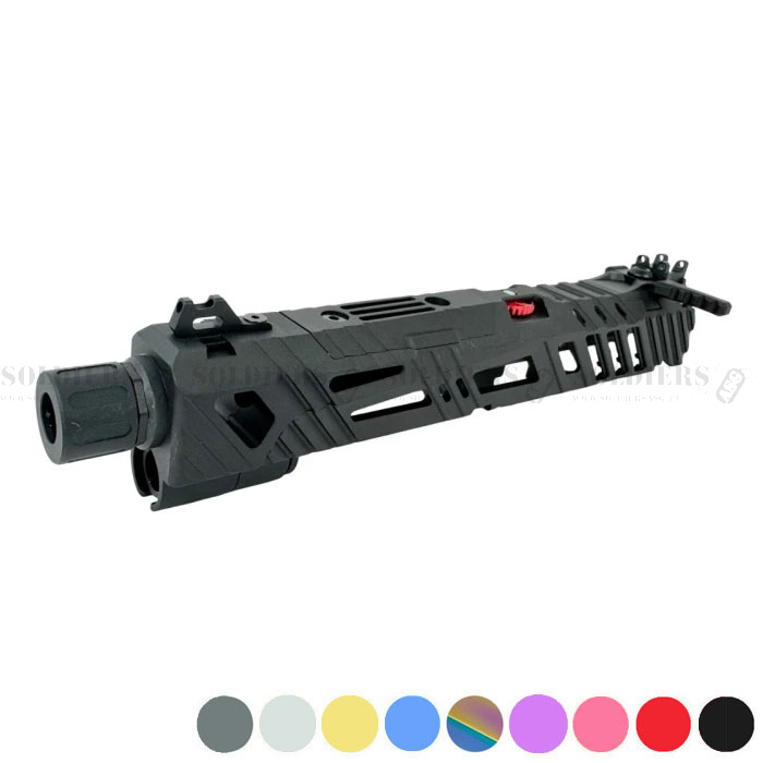 Na górze zamka znajduje się zintegrowana płytka montażowa do celownika kolimatorowego, co umożliwia bardziej precyzyjne i szybsze celowanie (celownik kolimatorowy nie jest dołączony, odpowiedni dla typu RMR). Producent zaleca wyłączenie stopera zamka i użycie zestawu Short-stroke dla szybszego działania i reakcji pistoletu, jak również wzmocnionej sprężyny dyszy CTM 180% (wszystkie te elementy są dołączone do zestawu).