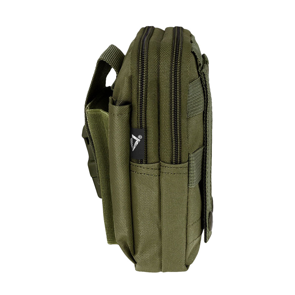 Dodatkowo na frontalnej części zasobnika została wszyta elastyczna kieszeń na telefon lub kompas, zamykana na solidną klamrę, zapięcie jest dodatkowo zabezpieczone rzepem. Zasobnik posiada również małą pionową kieszeń na długopis, lightstick lub nóż z klipsem. Dzięki systemowi MOLLE, może zostać przytroczony do pasa, plecaków lub zasobników biodrowych.
